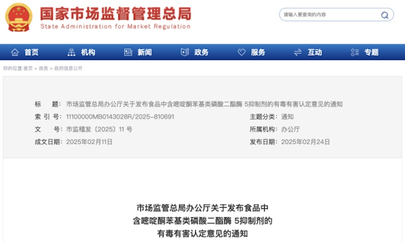 ¡¡¡¡2025Äê2ÔÂ24ÈÕ£¬¹ú¼ÒÊг¡î¿Ïµ×ְܾ칫ÌüÐû²¼¡¶Êг¡î¿Ïµ×ְܾ칫Ìü¹ØÓÚÐû²¼Ê³ÎïÖк¬à×à¤Íª±½»ùÀàÁ×Ëá¶þõ¥Ã¸5ÒÖÖÆ¼ÁµÄÓж¾Óк¦È϶¨Òâ¼ûµÄ֪ͨ¡·£¬È϶¨Ê³ÎïÖеÄTPN171µÈº¬à×à¤Íª±½»ùÀàµÄÁ×Ëá¶þõ¥Ã¸5ÒÖÖÆ¼ÁÊôÓÚ“Óж¾¡¢Óк¦µÄ·ÇʳÎïÖÊÁÏ” ¡£