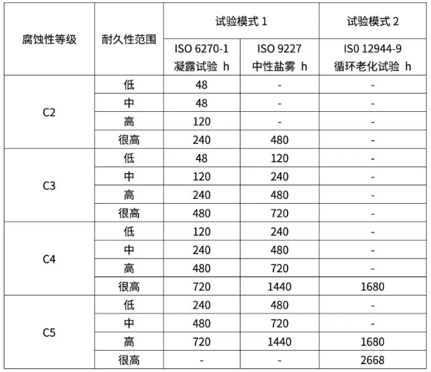 ¡¡¡¡ÒÔISO 12944-6:2018Öбí1ΪÒÀ¾Ý£¬C2ÖÁC5ÇÖÊ´ÐÔÆ·¼¶Ö÷ҪΪ̼¸Ö¡¢ÈȽþ¶ÆÐ¿¸ÖºÍÈÈÅçÍ¿½ðÊôÍ¿²ãµÄÍ¿ÁÏϵͳµÄ²âÊÔ³ÌÐò£»Á½¸öÊÔÑéģʽµÄÒ»Á¬Ê±¼ä¶¼»®¶¨Á˵ÄÇéÐÎÏ£¬¿ÉÒÔʹÓÃÈÎÒ»ÊÔÑéģʽ¡£