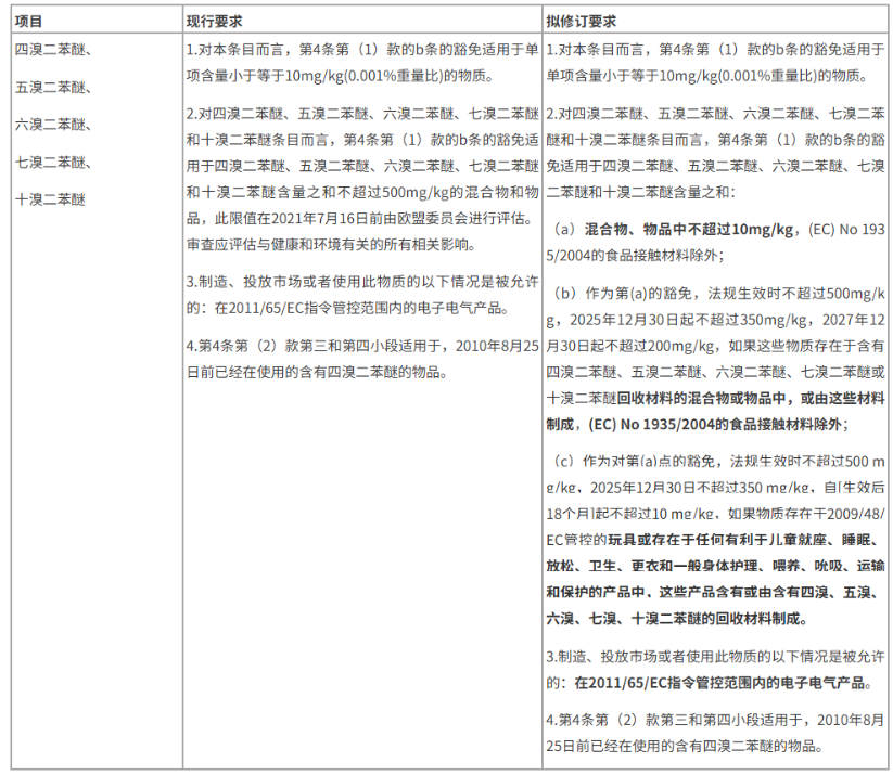 ¡¡¡¡ÏÖÐÐÖ÷ÒªÒªÇó£ºÎïÖÊÖÐÎåÏîÎïÖʵ¥Ïî≤10mg/kg£¬»ìÏýÎïºÍÎïÆ·ÖÐÎåÏî¼ÓºÍ≤500mg/kg£»RoHS²úÆ·ÖÐËÄäå¡¢Îåäå¡¢Áùäå¡¢ÆßäåºÍÊ®äå¶þ±½ÃÑ¿íÃâÓÚPOPs¹æÔò£¬ÐÞ¶©ºóÖ÷ÒªÒªÇó£ºÎïÖÊÖÐÎåÏîÎïÖʵ¥Ïî≤10mg/kg£¬»ìÏýÎïºÍÎïÆ·ÖÐÎåÏî¼ÓºÍ≤10mg/kg£¨ÓɽÓÄÉÖÊÁÏÖÆ³ÉµÄ»ìÏýÎï¡¢ÎïÆ·¡¢Íæ¾ß¡¢¶ùͯÓÃÆ·ÓÐÌØ¶¨ÏÞÖµ£©£»RoHS²úÆ·ÖÐËÄäå¡¢Îåäå¡¢Áùäå¡¢ÆßäåºÍÊ®äå¶þ±½ÃÑ¿íÃâÓÚPOPs¹æÔò£¬ÏêÇéÈçÏ£º