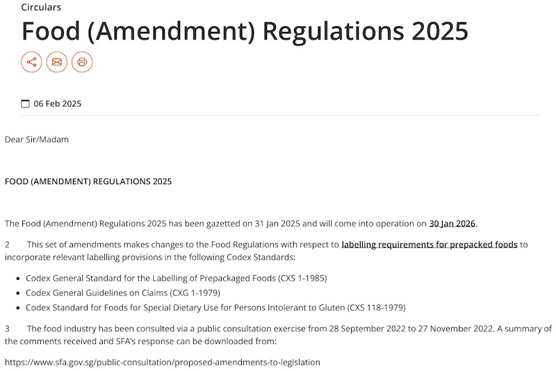 ÐÂ¼ÓÆÂʳÎï¾Ö£¨SFA£©Õë¶ÔÔ¤°üװʳÎï±êǩҪÇó¶Ô¡¶Ê³ÎïÌõÀý¡·¾ÙÐÐÁËÐÞ¶©£¬¡¶2025ÄêʳÎÐÞ¶©£©¹æÀý¡·ÒÑÓÚ2025Äê1ÔÂ31ÈÕ¿¯ÏÜ£¬²¢½«ÓÚ2026Äê1ÔÂ30ÈÕÉúЧ¡£¸Ã¸üвο¼ÁËCodex£¨Ê³Îï·¨µäίԱ»á£©±ê×¼ÖеÄÏà¹Ø»®¶¨¡£