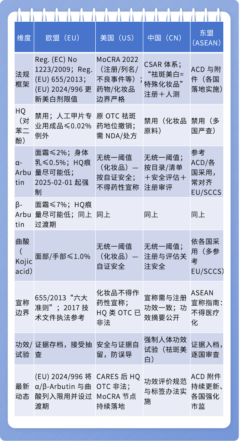 ¡¡¡¡“EUÏÈÐС¢ASEAN¸ú½ø¡¢USÈ¥Ò©ÐÔ»¯¡¢CNÇ¿ÖÆÈ˲â”ÊÇÄ¿½ñÃÀ°×Àà²úÆ·È«Çò»¯µÄ×ÜÌåõè¾¶¡£Á¢Ïî¼´½¨Éè¿ç·¨ÓòÏÞÖµ¾ØÕóÓëÐû³Æ´Ê¿â£»EU°´(EU)2024/996ÉèÖÃ2/0.5/7/1%µÄÅä·½ãÐÖµÓë¹ý¶ÉÆÚÇл»£»US½ö×öÍâ¹Û¸ÄÉÆËßÇó£»CNÌáÇ°Ëø¶¨ÈË²â¼Æ»®Óë»ú¹¹£¬°ÑHQºÛÁ¿¿ØÖÆ¡¢ÖÊÁÏÇå¾²ÆÀ¹ÀÄÉÈë×¢²áÊÖÒÕ×ÊÁÏ£¬È·±£ÉÏÊкϹæÓëºóÐø³é²éÎȽ¡¡£