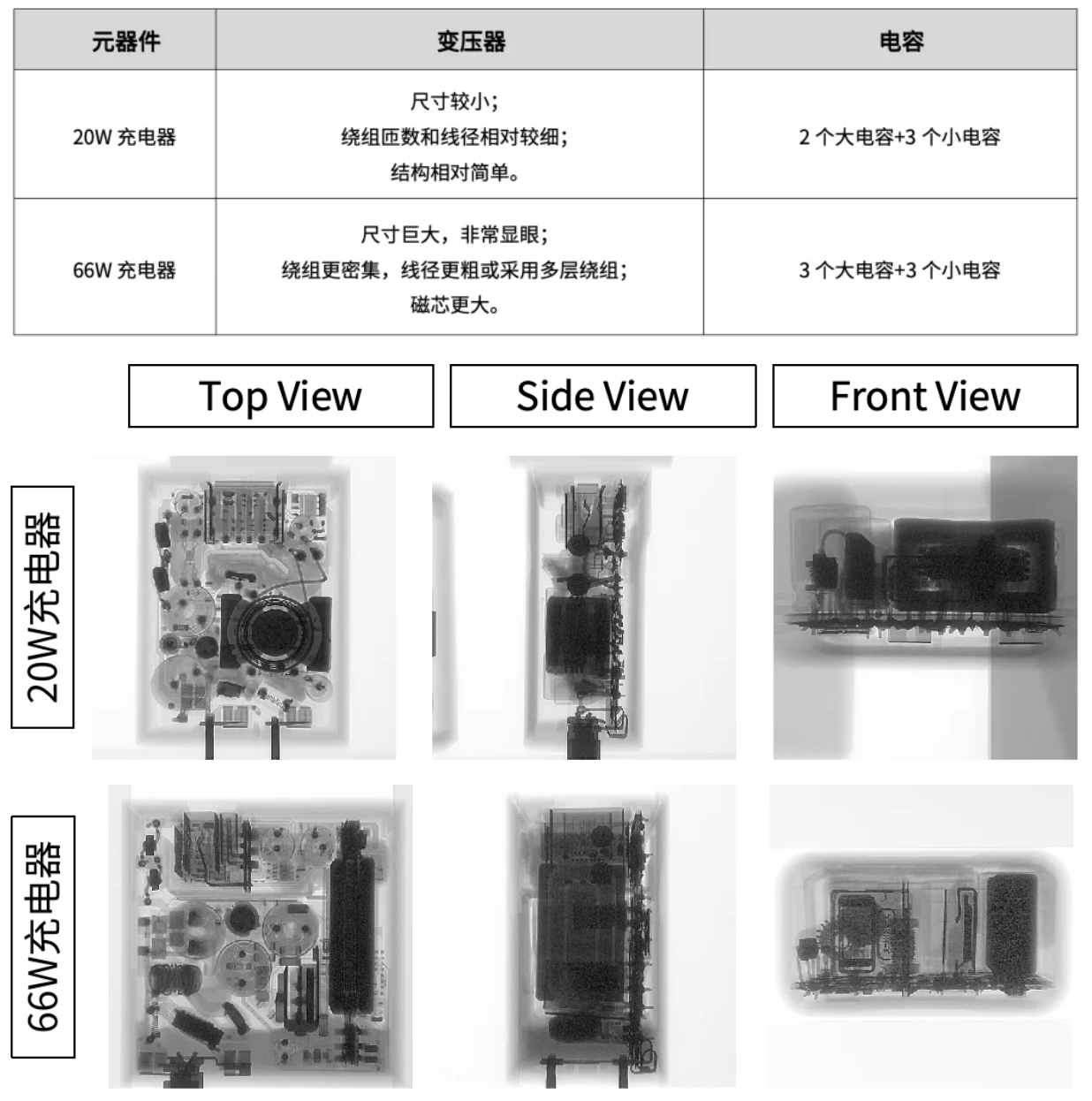 ¡¡¡¡Í¨¹ý2D X¹âÓ°ÏñÀ´±ÈÕÕ20WºÍ66WµçÔ´ÊÊÅäÆ÷µÄÄÚ²¿½á¹¹£º